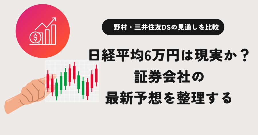 2026年に入り、日本株に対する見方は一段と強気に傾いています。特に注目を集めているのが、証券会社各社による年末6万円台予想です。 2月に相次いだ上方修正は一時的な話題で終わるかと思われましたが、4月時点でもその見通しは大きく崩れていません。むしろ、足元の相場環境を踏まえて強気維持が確認されている点は見逃せません。 本記事では、野村證券と三井住友DSアセットマネジメントの見通しを軸に、最新のコメントも踏まえながら整理していきます。 野村證券:日経平均60,000円予想を維持 野村證券は2026年2月、日経 ...