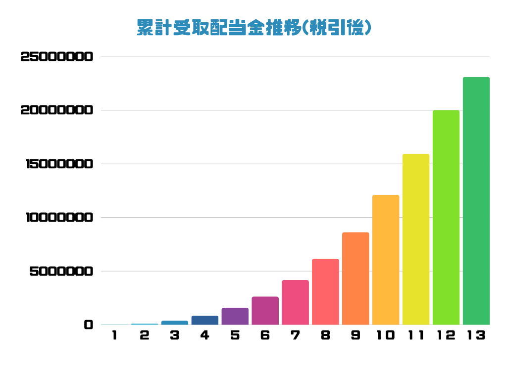 現在の累計配当金は23.106,585円です。2300万とちょっとですね。