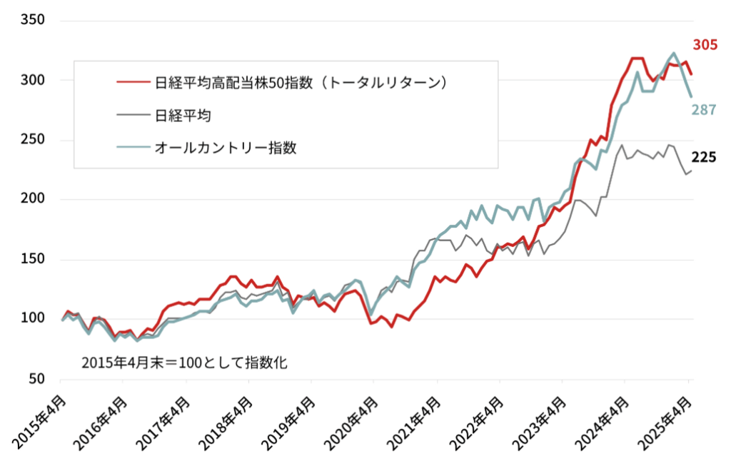 連動する「日経平均高配当株50指数(トータルリターン)」は、過去10年で日経平均やMSCIオールカントリー指数(ACWI)を上回るパフォーマンスを記録しています。