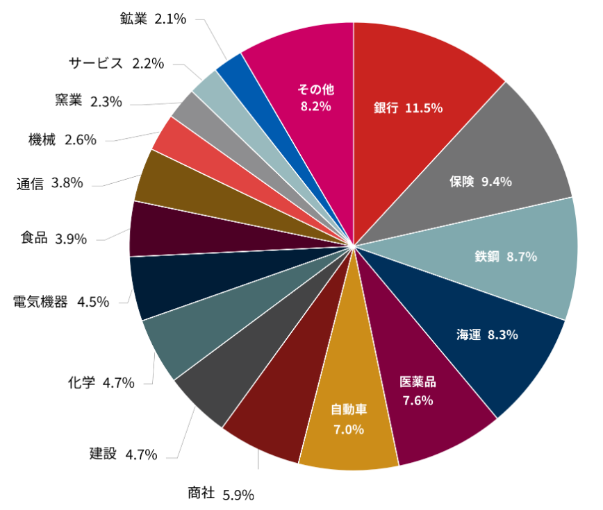 ただし、特定業種に偏りすぎず、商社・製薬・エネルギー・通信など幅広い銘柄を含んでいます。
