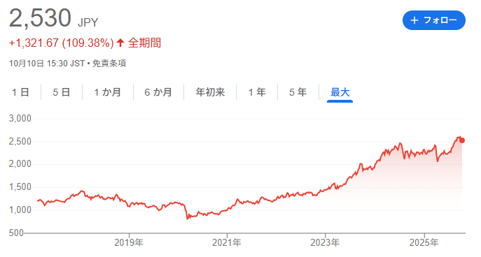私も2025年10月現在で、1600株程度保有しており、インカムもキャピタルも両取り中。