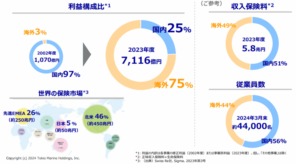 現在では国内にとどまらず、世界57カ国・365社のグループ会社を展開し、利益の約半分を海外で稼ぐ「グローバル保険グループ」へと成長しています。