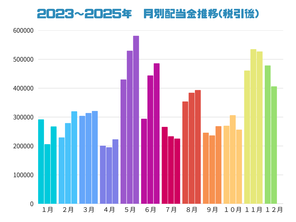 年間12か月の配当金を棒グラフでまとめると、月ごとの偏りや傾向がひと目で分かります。