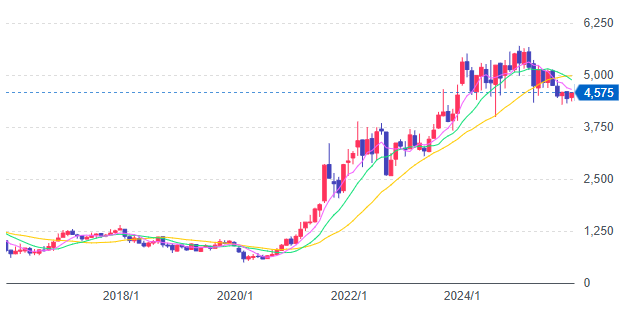 株価4,575円ベースで利回り4.37%と、減配後でも依然として魅力的な水準です。