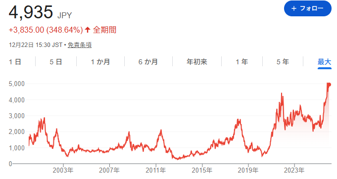直近では減益局面にもかかわらず増配を継続しており、株主還元への意識は明確です。株価4,935円前後で利回り約3.0%、PER14.44倍、PBR1.04倍という水準は、半導体関連株としては過度な割高感はありません。