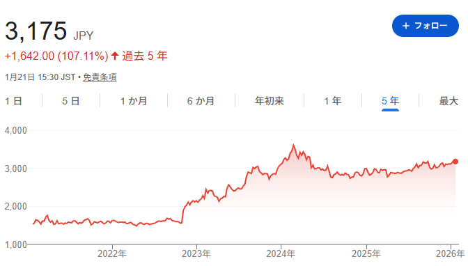 2023年に株価は大きく上昇。2025年から緩やかに上昇を続けています。