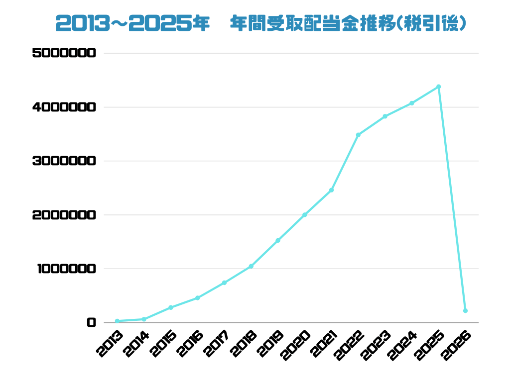2020年から2021年にかけて大きく伸びているのは、ドル円が100円台から140円台に推移したことが影響しています。2026年はまだ1月分のみですので、少ないです。株価の激騰により買い増しが難しくなってきましたが、2026年は2025年を超えることができるでしょうか。目標の税引き後600万円、そしてFIREをこれからも淡々と目指します。