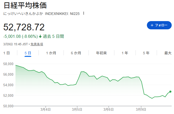 2026年3月9日月曜日、日経平均はまたしても大きく下落となりました。