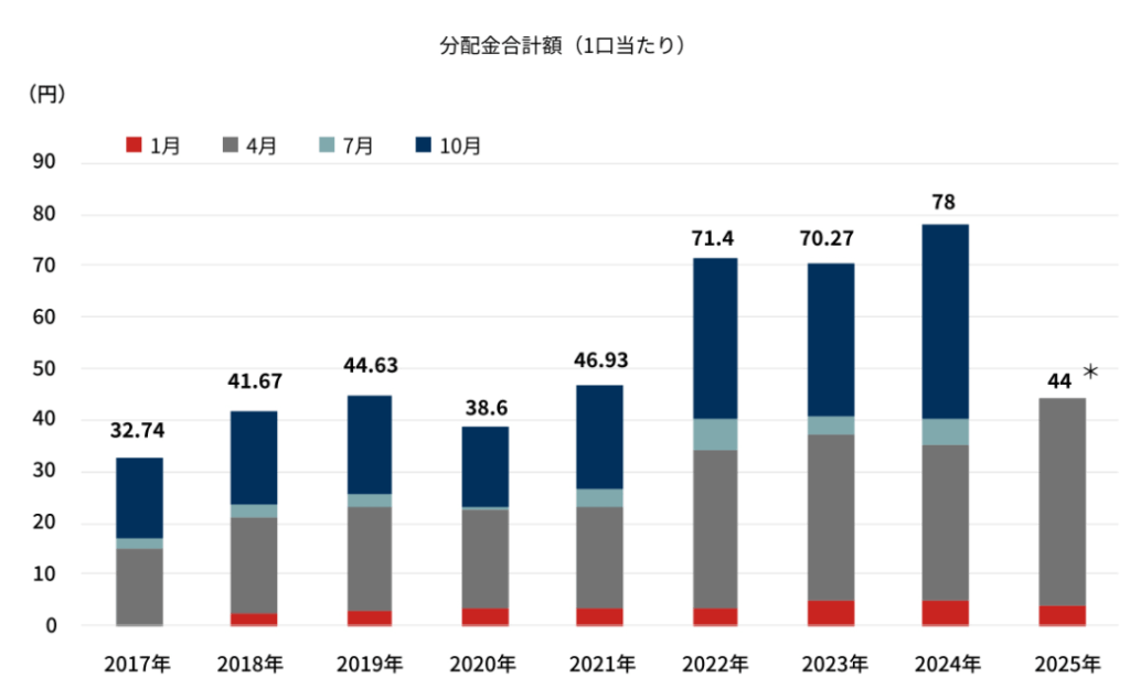 2017年の年間分配金は 32.74円でしたが、2024年には 78円まで増えています。