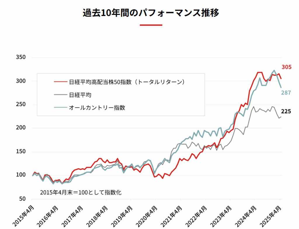 しかし、日経平均高配当株50指数のパフォーマンスを見ると、必ずしもそうとは言えません。