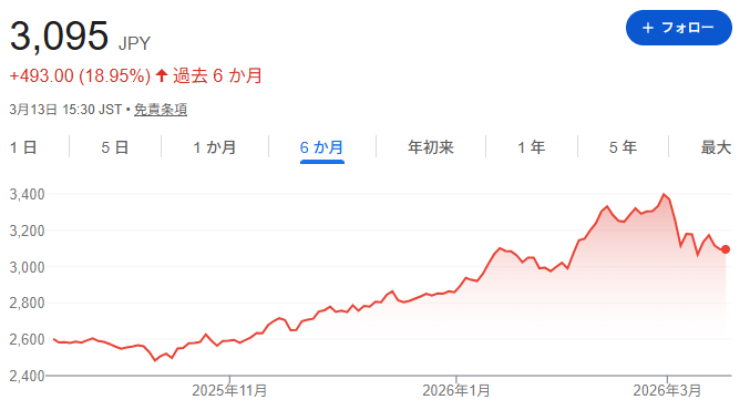 現在の取引所価格は 3,095円(2026年3月13日終値)。この価格でおよそ 160口ほどを追加購入し、間もなく保有数は2000株に到達します。