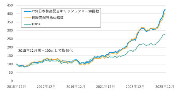 TOPIXをアウトパフォームし、他の高配当指数と同等以上の実績です。