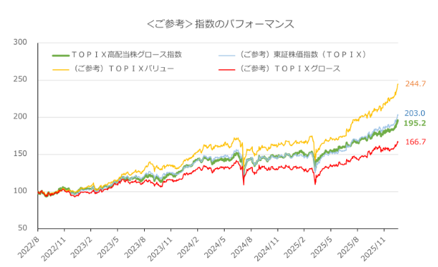 グロースの上昇力を取り込みつつ、 配当が下支えして値動きを安定させるという、バランス型の挙動です。