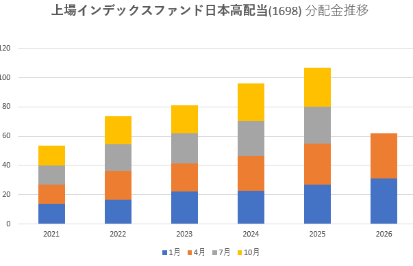 一方で1698は、各期のバラつきが比較的小さく、年間を通して均等に近い分配となっており、キャッシュフローが読みやすいのが特徴です。