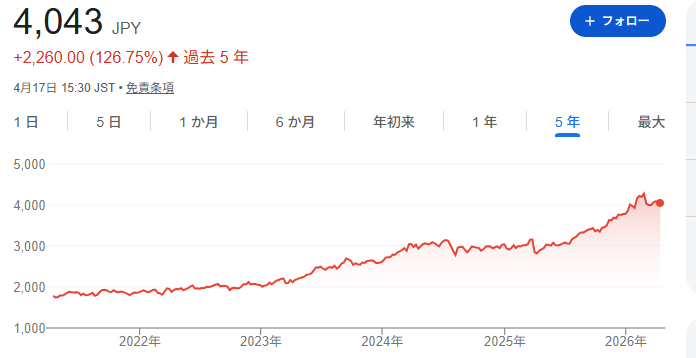 直近数年の株価推移を見ると、大きな暴落を挟まず緩やかに右肩上がりという動きになっています。