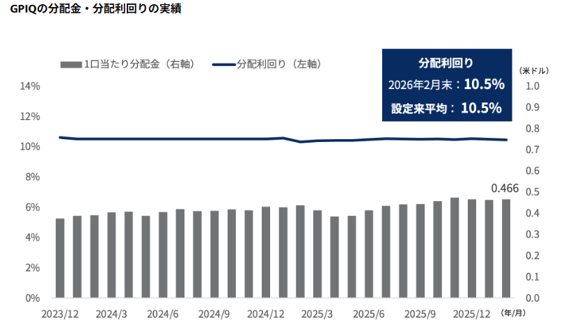 このグラフを見ると、GPIQの特徴である安定した分配と高い利回り水準がよく分かります。