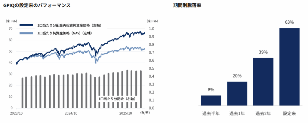 特に注目すべきは、これらが分配金込みのトータルリターンである点です。GPIQは短期で値幅を取りにいく商品というよりも、