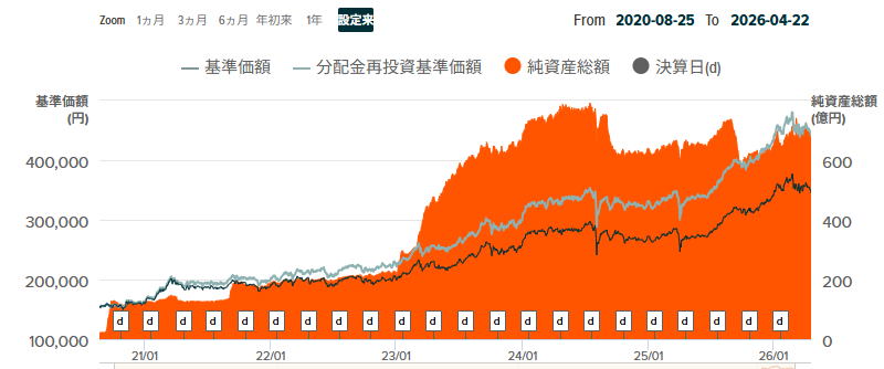 基準価額の動きには波があるものの、純資産総額は安定的に拡大しています。これは価格変動に関わらず資金が入り続けていることを示しており、長期投資対象として一定の評価を得ていることの表れといえるでしょう。