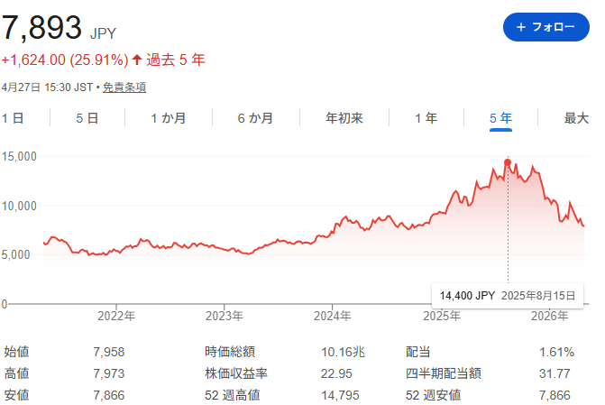 株価は52週最高値の14795円から半値近くダウン。日経平均が6万円台に到達する中での下落は、強い違和感を伴う動きでもあります。