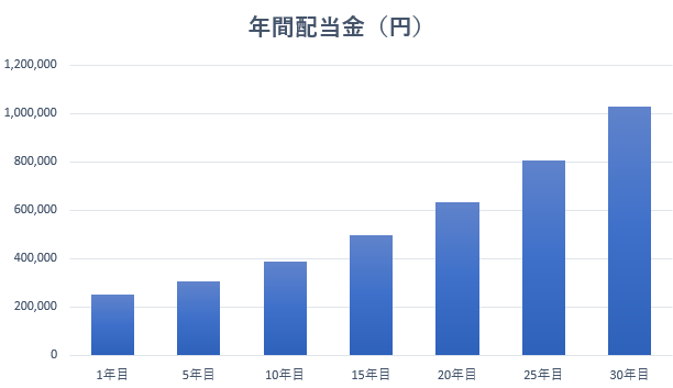 このシミュレーションでは、初年度利回り2.5%、年平均増配率5%と保守的に見積もった数値で計算しています。